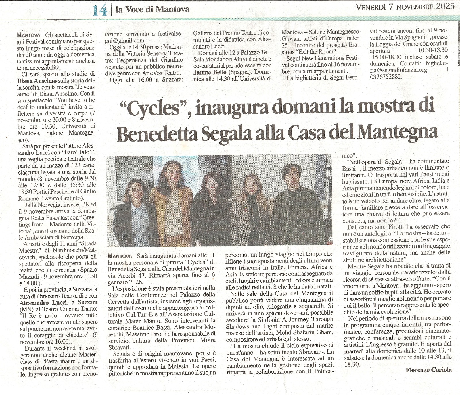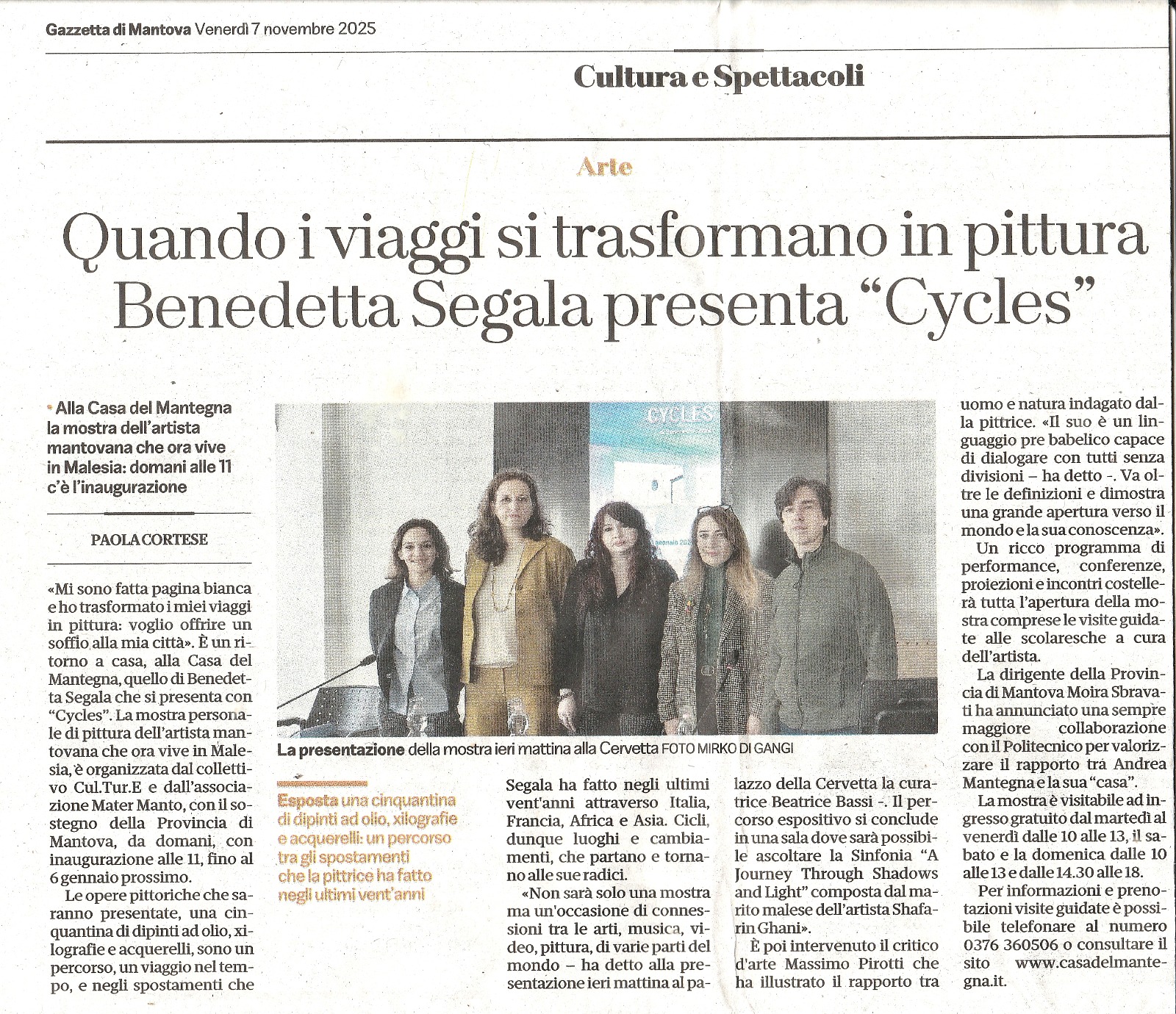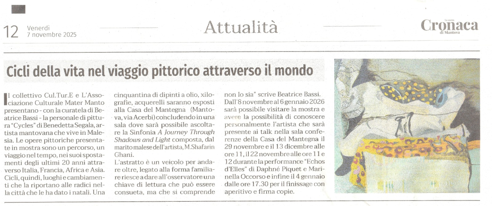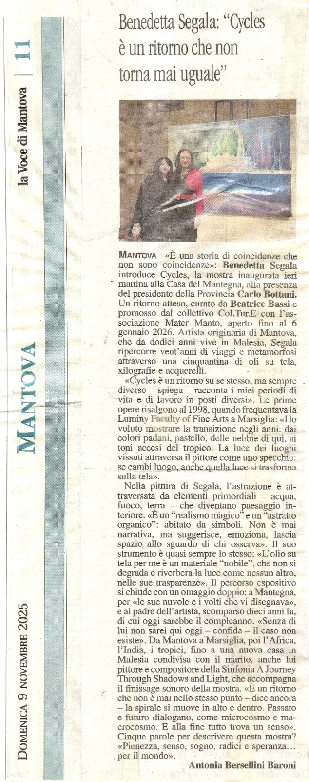 Painting Solo Exhibition CYCLES – Casa del Mantegna MANTOVA – 8 November 2025 / 6 January 2026 February 3, 2026 admin News 0 Comments Painting Solo Exhibition CYCLES – Casa del Mantegna MANTOVA – 8 November 2025 / 6 January 2026 cycles Share This Twitter Facebook LinkedIn Email admin Related Posts Interview with Benedetta Segala An interview by Alessandro Trabucco for the column The World of Tomorrow https://www.obiettivonews.it/2024/11/01/intervista-a-benedetta-segala/ Article Options The Edge 2020 "PROJECT A: Last Man Standing & Craven A" - Curator: Benedetta Segala Article Malaysiakini 2020 "Project A: Last Man Standing & Craven A" - Curator: Benedetta Segala Comments (0) Leave a Reply Cancel replyYour email address will not be published. Required fields are marked *Name * Email * Website Save my name, email, and website in this browser for the next time I comment. Comment *